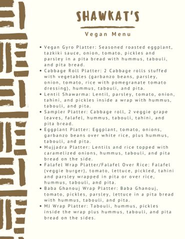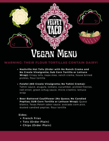 This guide is subject to menu items changing, misinformation being provided by restaurants, and may list vegan options that are cross-contaminated. We try to be as accurate as possible, but errors may occur. Please discuss your individual concerns with restaurant managers if you have an allergy. These are not allergen menus. If you notice any errors, please email sarahhydentvg@gmail.com